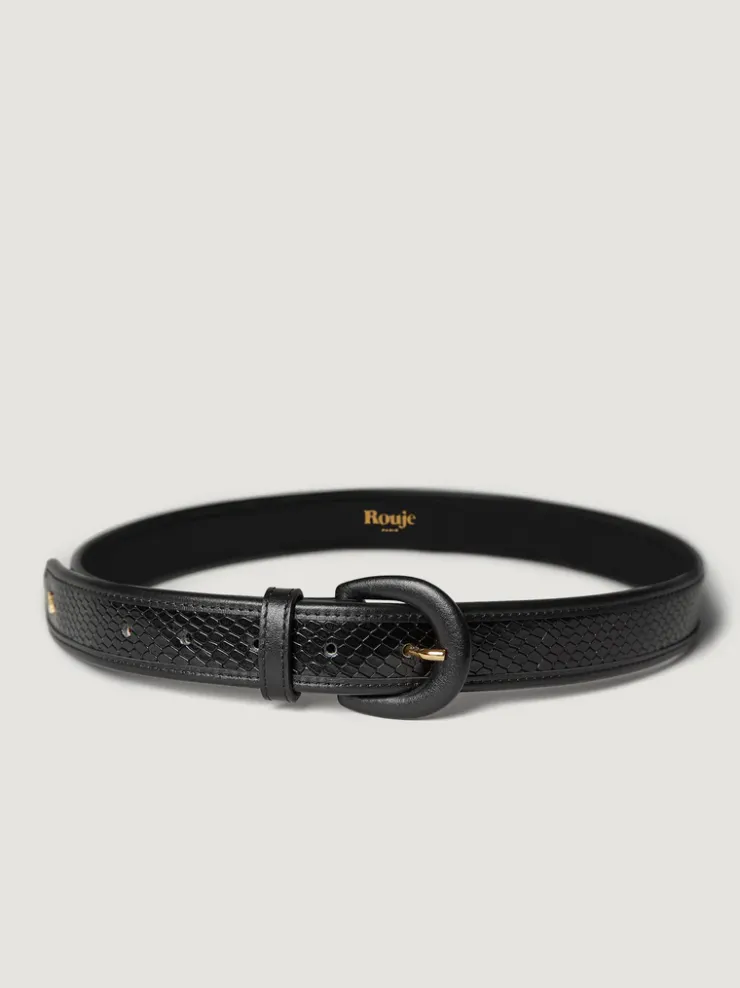 Ceinture en cuir effet python.Coloris noirBoucle rondeSigle « R » doréFabriquée en Italie