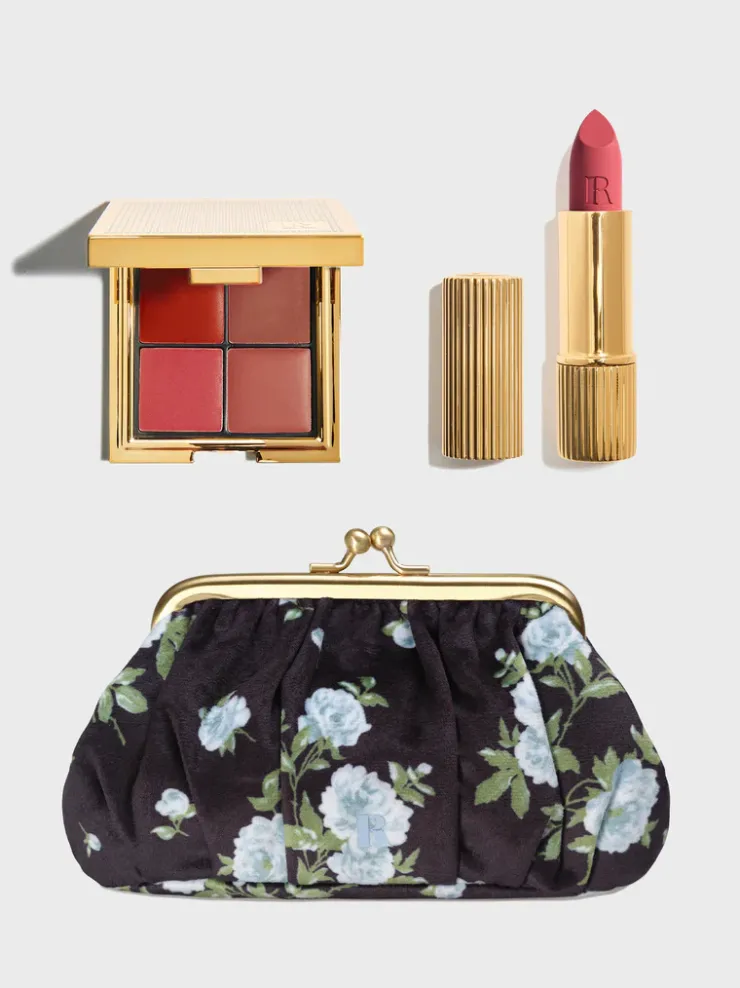 Pour un flush assumé, tapotez un peu de la Palette Lèvres sur vos paupières, le haut de vos pommettes et l’arête de votre nez. Terminez votre look en appliquant le Rouge à Lèvres, à la nouvelle formule naturelle, pour un résultat intense. Le tout glissé dans un pochon en édition limitée.