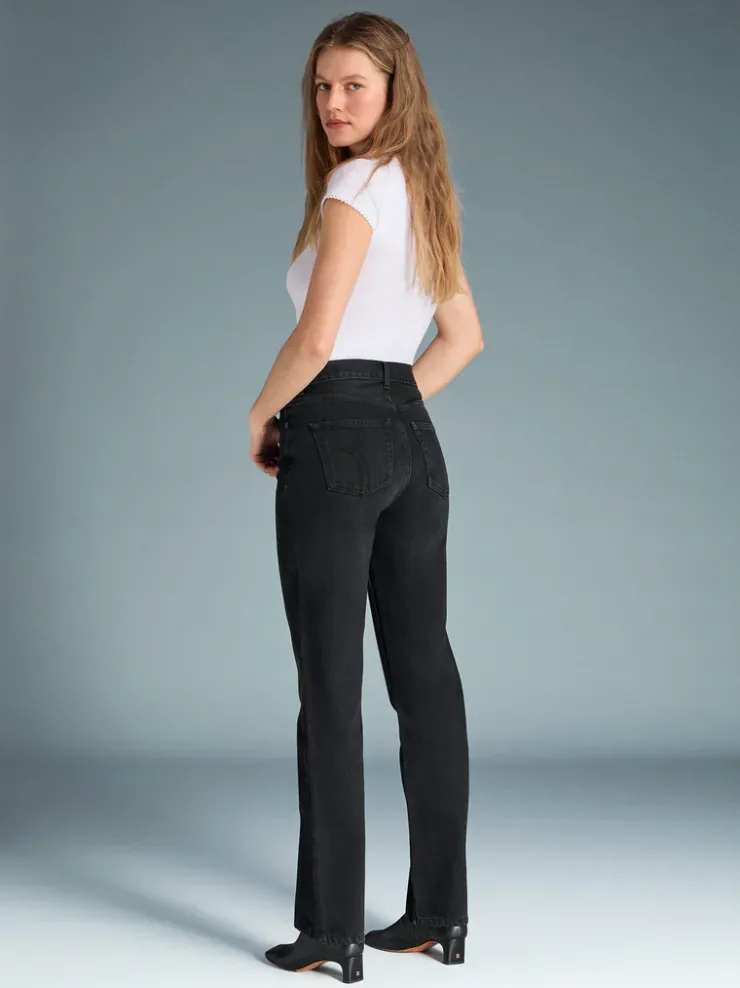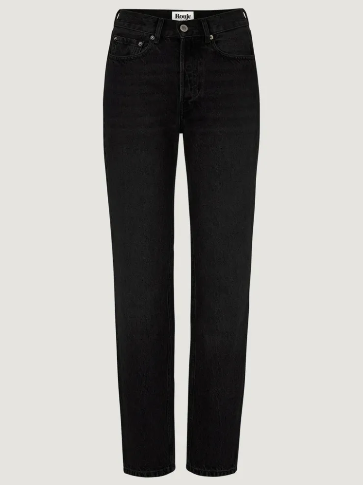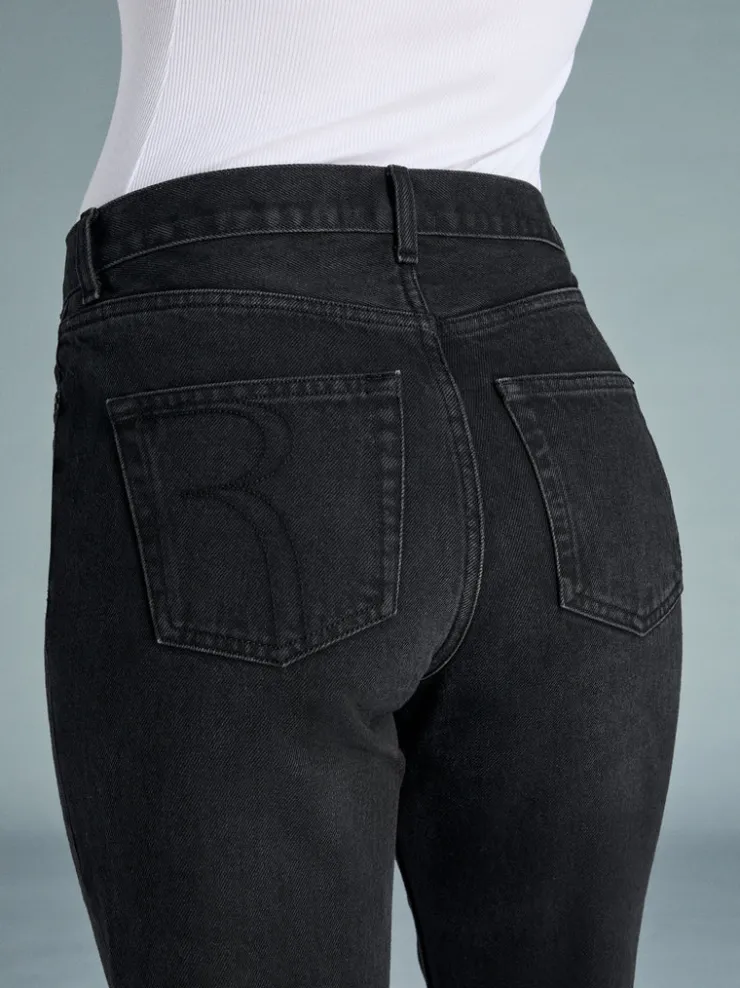 Jean droit avec coupe vintage.Coloris noirCoupe droiteTaille mi-haute5 pochesFermeture à boutonsBroderie « R » sur la poc…