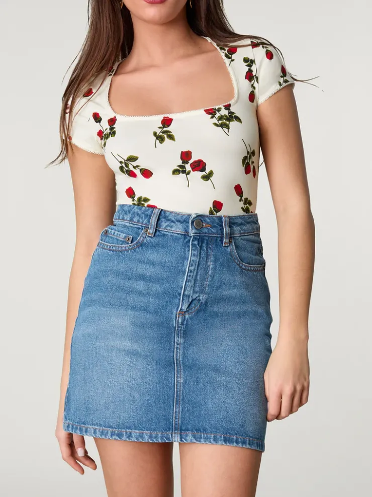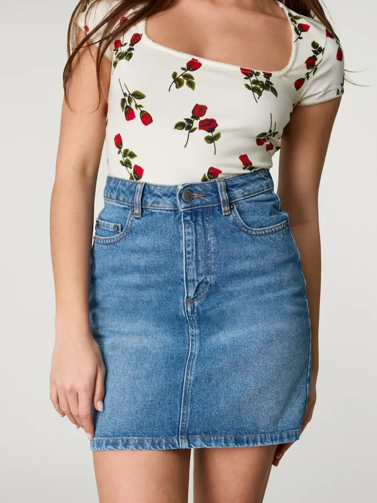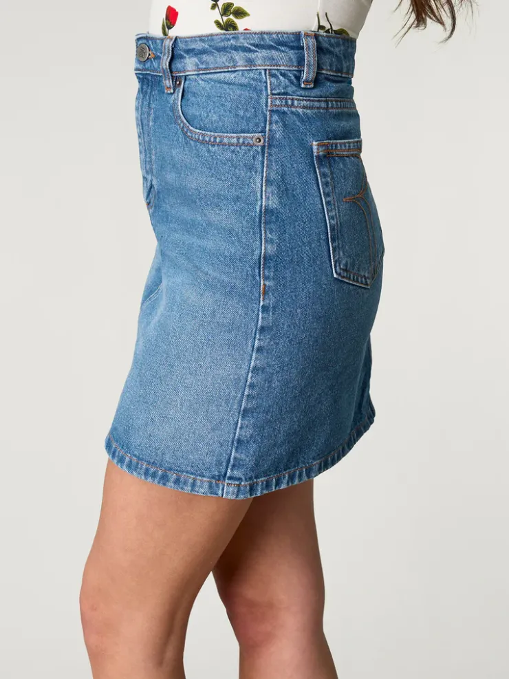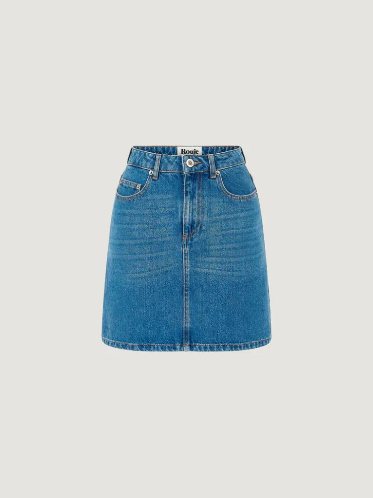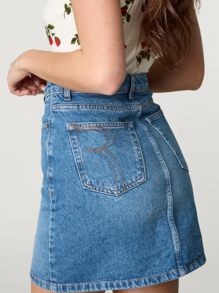 Mini jupe en denim.Coloris bleu indigo double stoneDeux poches frontalesBroderie « R » sur la poche arrière gaucheCette p…