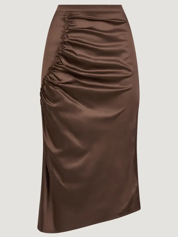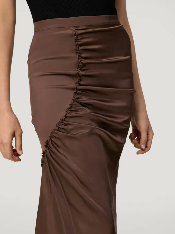 Jupe midi ajustée.Coloris caféCoupe taille haute et asymétriqueTissu stretchEffet de volantFermeture par un zip invis…