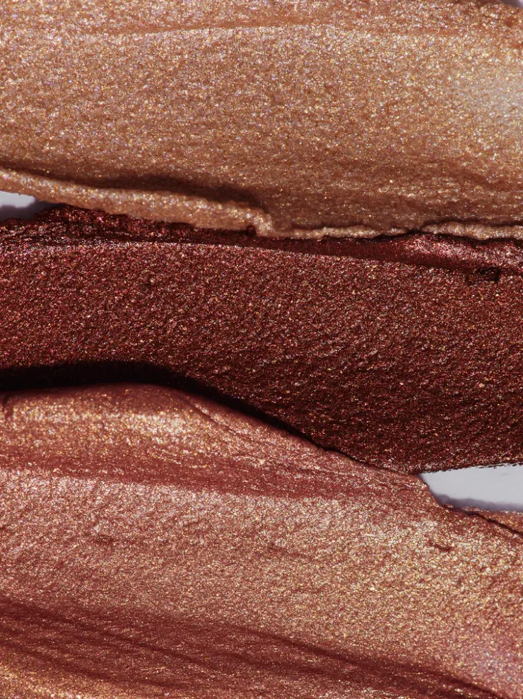 Notre toute première palette pour les yeux dévoile trois nuances pailletées et lumineuses : Nude Irisé, Or Rose et Brun Rouge. Leur texture crémeuse s’applique au doigt ou au pinceau et enveloppe la paupière pour une finition parfaite.