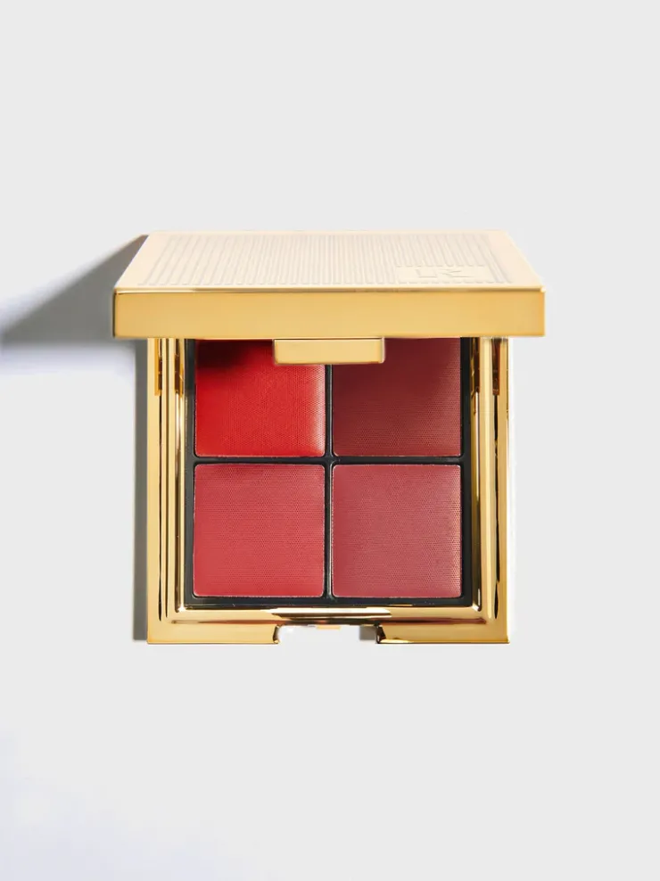 La Palette Madame propose quatre teintes rosées, crémeuses et fondantes : rouge passion, bordeaux clair, rose éclat et bois de rose. Elles peuvent être mélangées pour un résultat unique et une intensité sur mesure. Tamponnez les couleurs au doigt sur vos lèvres, vos joues et même vos yeux. Présenté dans un élégant boîtier doré, elle vous suivra partout.