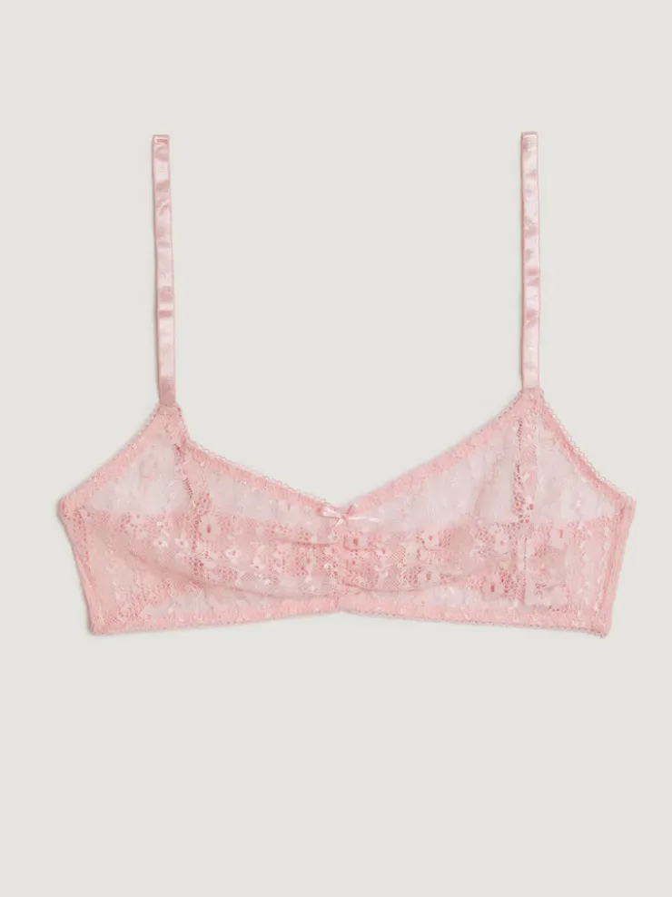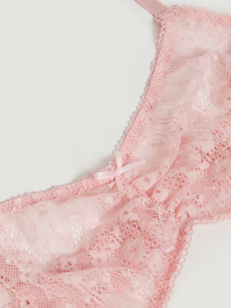 Soutien-gorge bandeau. Coloris roseDentelle fleurie à effet rayéSans armatureÉlastique resserré au milieuDétail de …