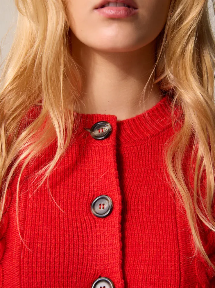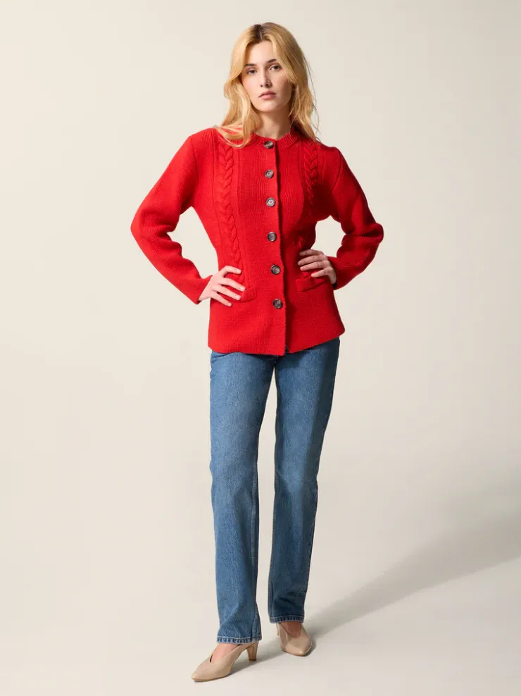 Cardigan autrichien à torsades.Coloris rougeMaille torsadéeCol rond bord côteFausse poches passepoilManches longues B…