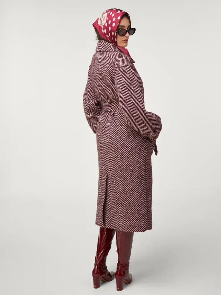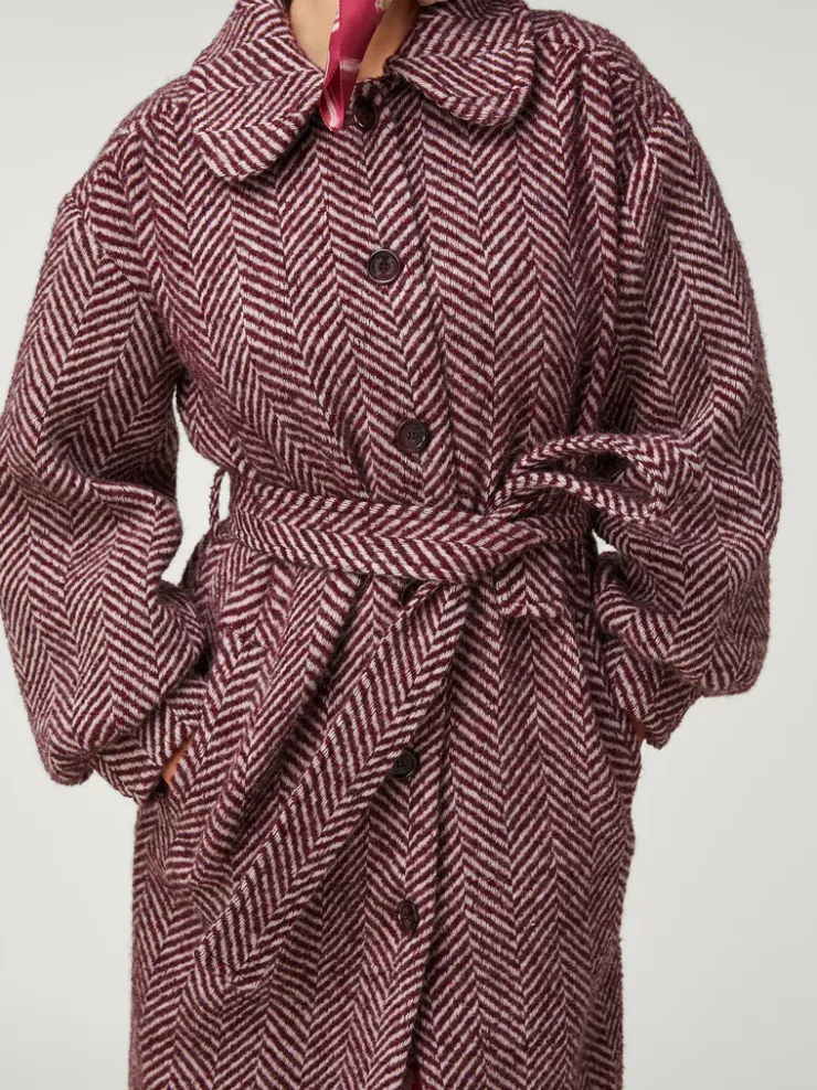 Manteau long.Imprimé chevrons bordeaux Contient de la laineFermeture par boutons effet corne assortis et siglésBouton …