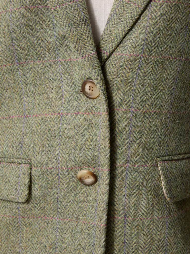 Veste tailleur oversize.Carreaux chevron vert mentheBoutons et doublure sigléesDeux poches devantFente dans le dosBas d…