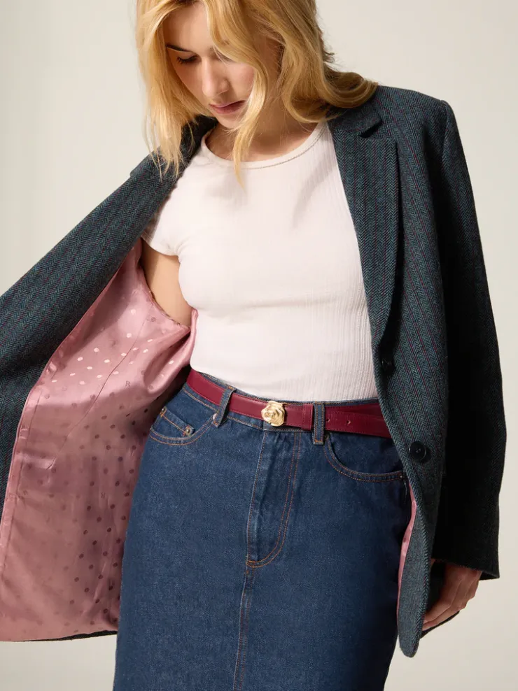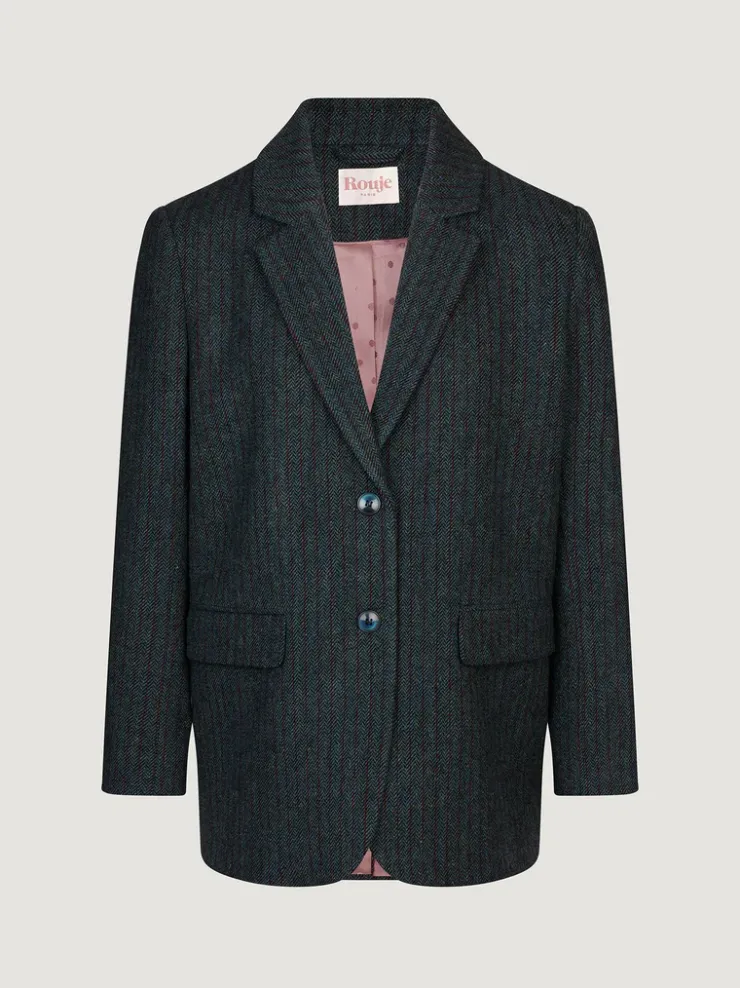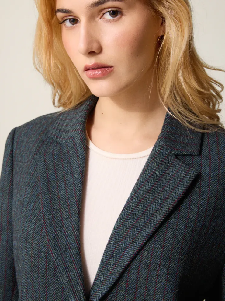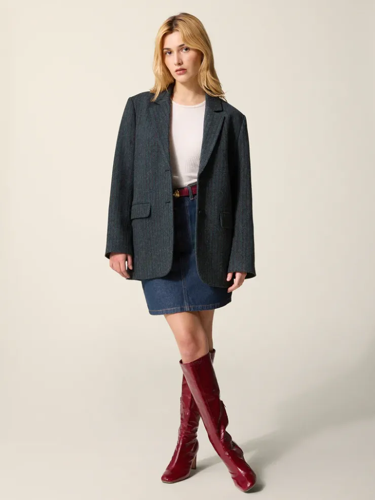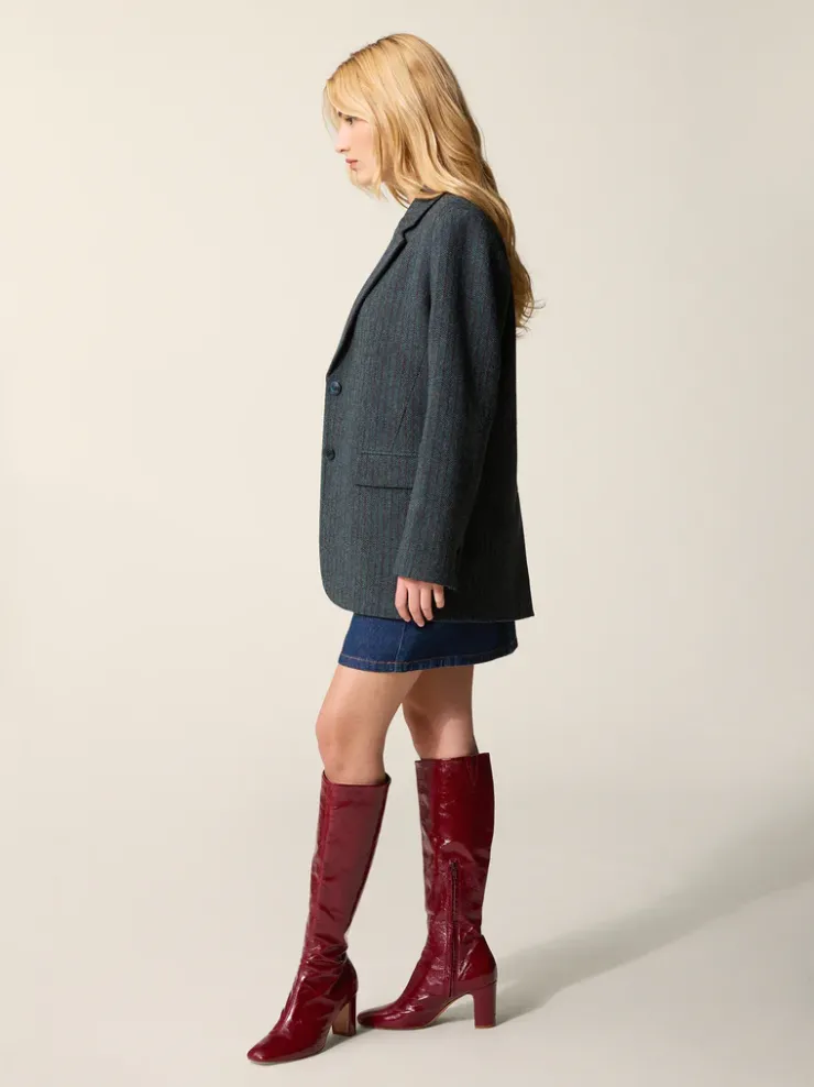 Veste tailleur oversize.Imprimé rayé bleu100% laineDeux poches extérieures à rabat Fente dans le dosBas des manches …