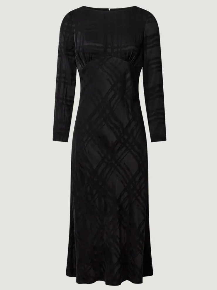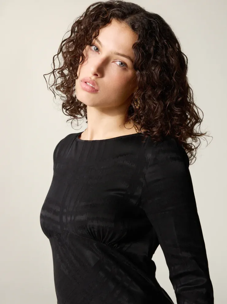 Robe midi à manches longues.Coloris jacquard noirDécoupe sous le décolletéGoutte dans le dos fermée par deux bouton…
