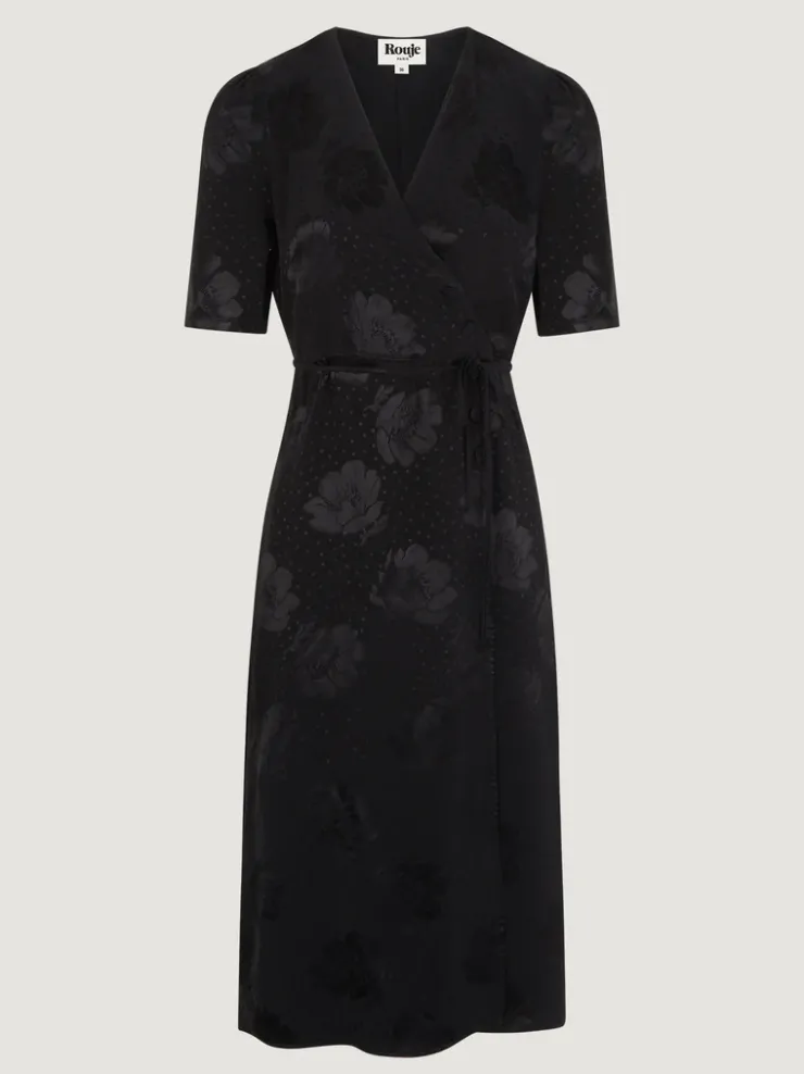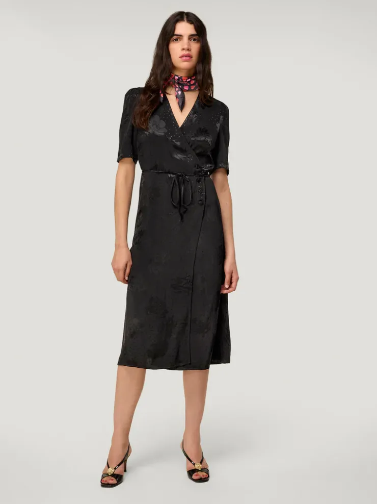 Robe portefeuille mi-longue à manches courtes.Imprimé jacquard noir pois et fleursEncolure VFermeture par cinq boutons…