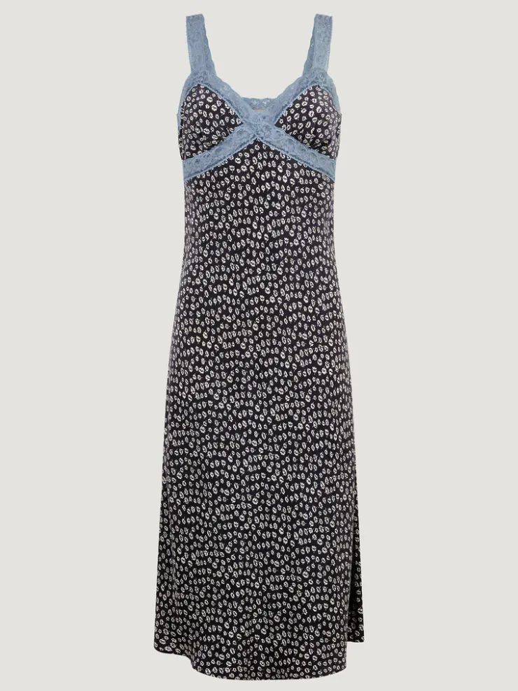 Robe midi fluide avec dentelle.Imprimé bleuet marineDécolleté en V Dentelle fleurie contrastante bleu ciel sur les br…