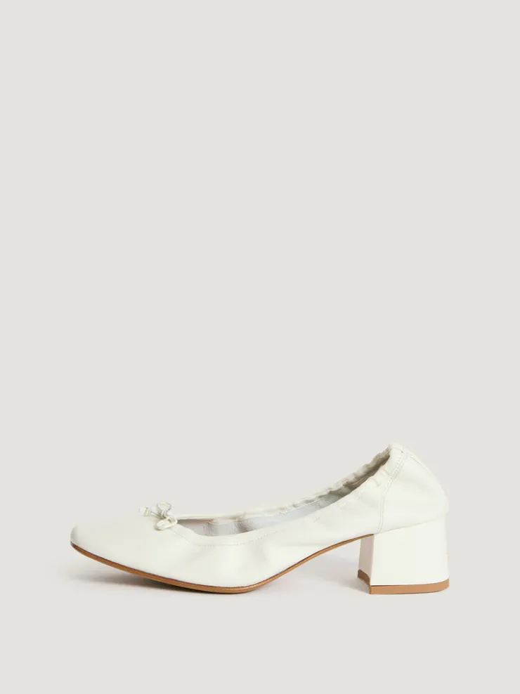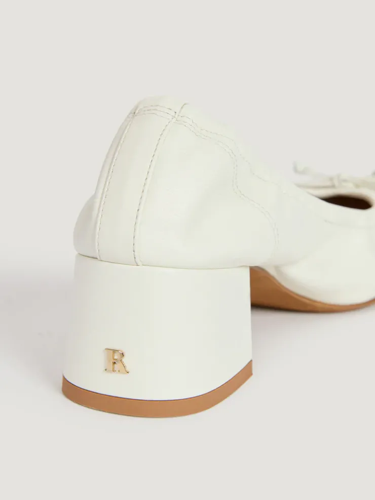 Ballerines à petit talon en cuir.Coloris blancÉlastique de resserrage et noeudHauteur du talon : 4,8 cmSigle « R » …