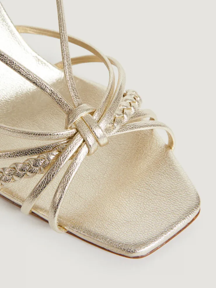 Sandales hautes tressées. Coloris orHauteur de talon : 7,5 cmJeu de cuir tressé et lisseBoucle de fermeture réglableF…