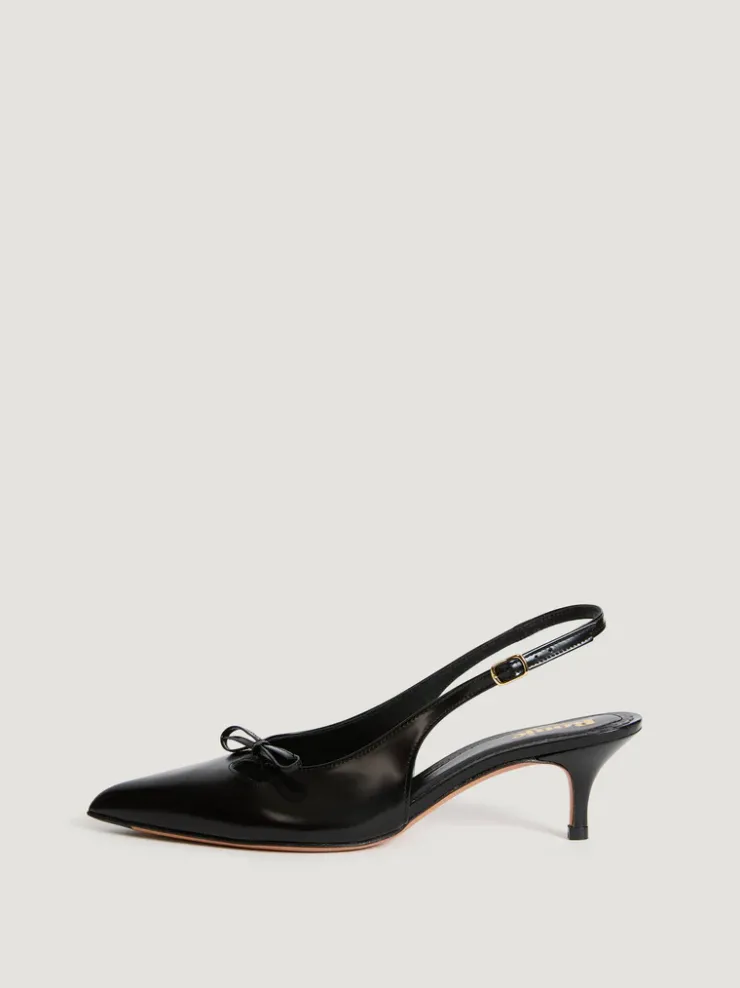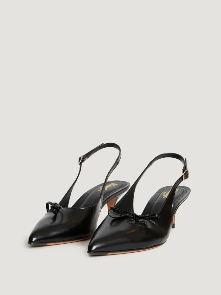 Escarpins en cuir glacé façon slingback.Coloris noir Bout pointuHauteur du talon : 4,5 cmDécoupe en forme de goutte s…
