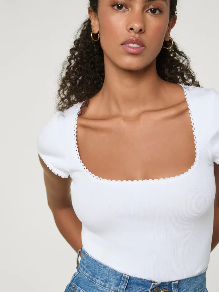 T-shirt stretch à col carré.Coloris blancManches courtesFinitions croquetFabriqué en France