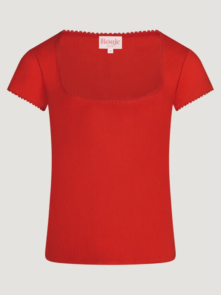 T-shirt à col carré. Coloris rougeJersey mini côtesBordure croquet au niveau du col et des manchesFabriqué en France