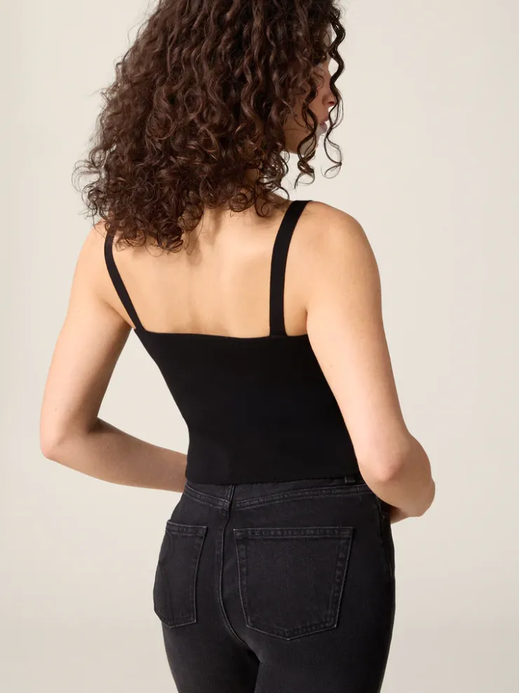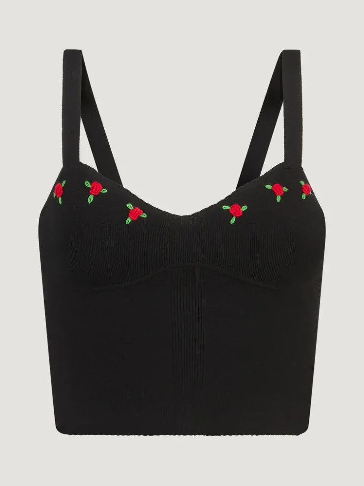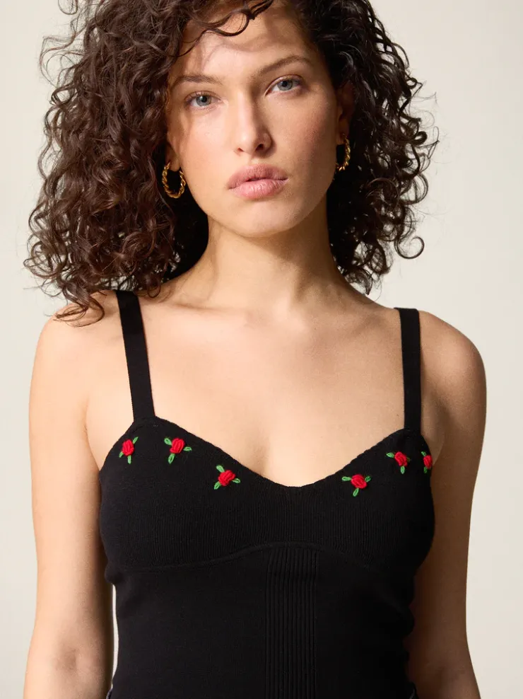 Top style petit bustier brodé.Coloris noirFines bretellesRoses brodées Bande contrastante verticale ton sur tonDécoup…