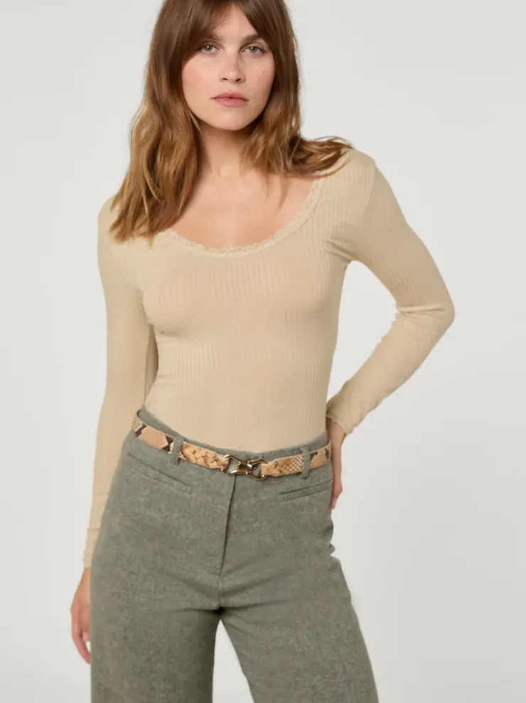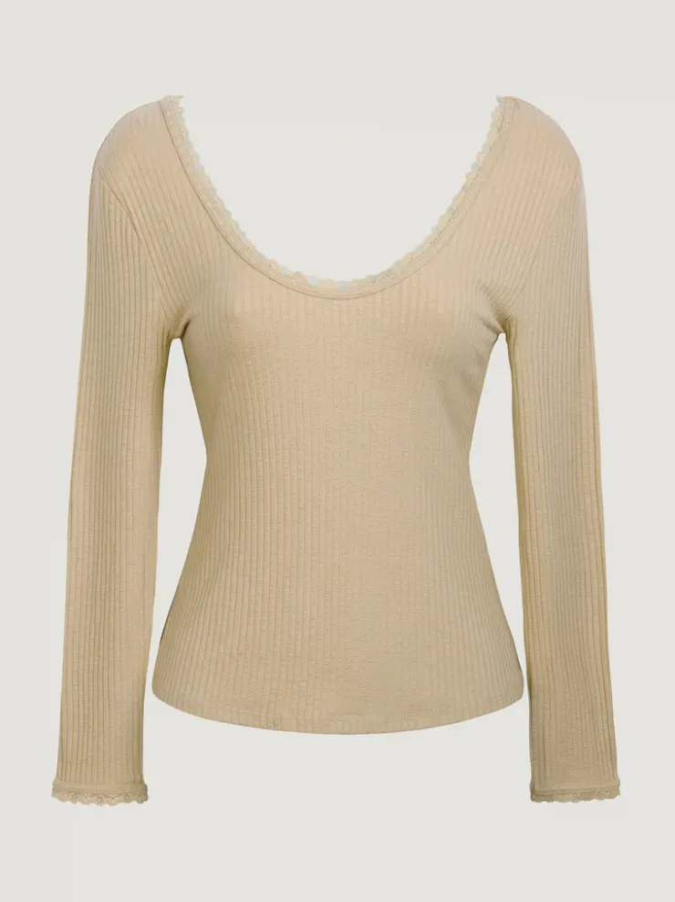 T-shirt près du corps en jersey.Coloris crèmeMatière côteléeDentelle au décolletéDécolleté légèrement carréF…