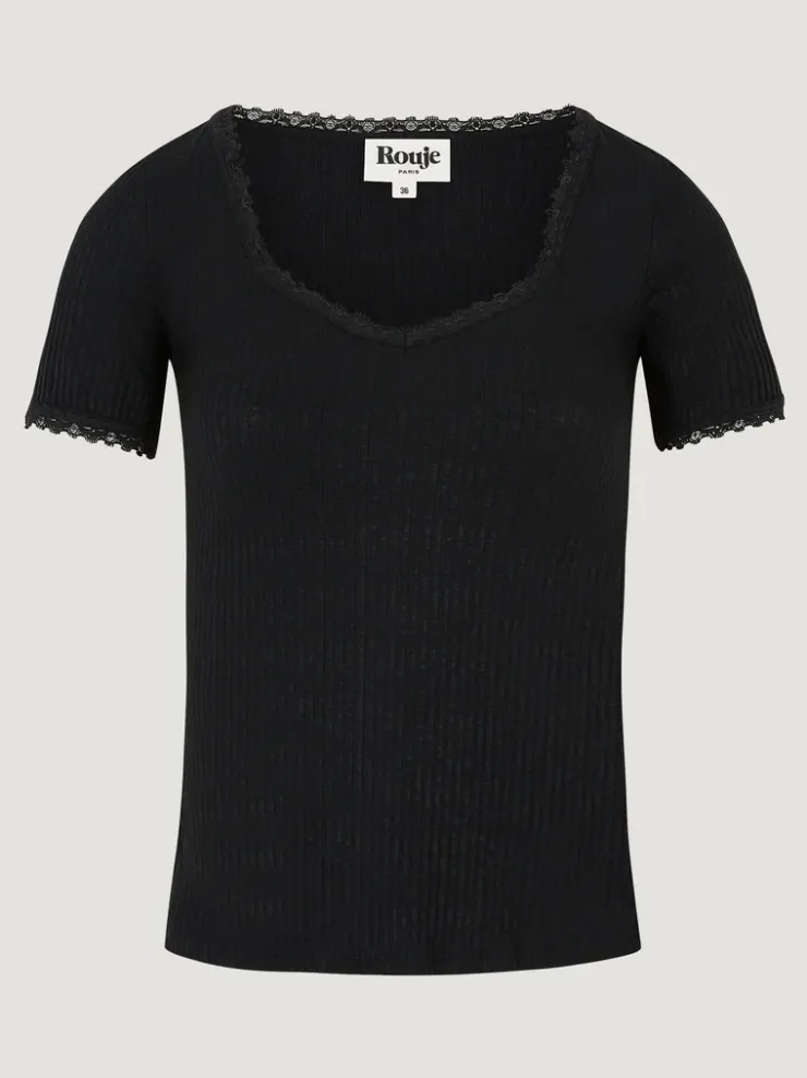 T-shirt avec dentelle près du corps.Coloris noirDentelle au decolleté et sur les manchesMatière côtelée et manches …
